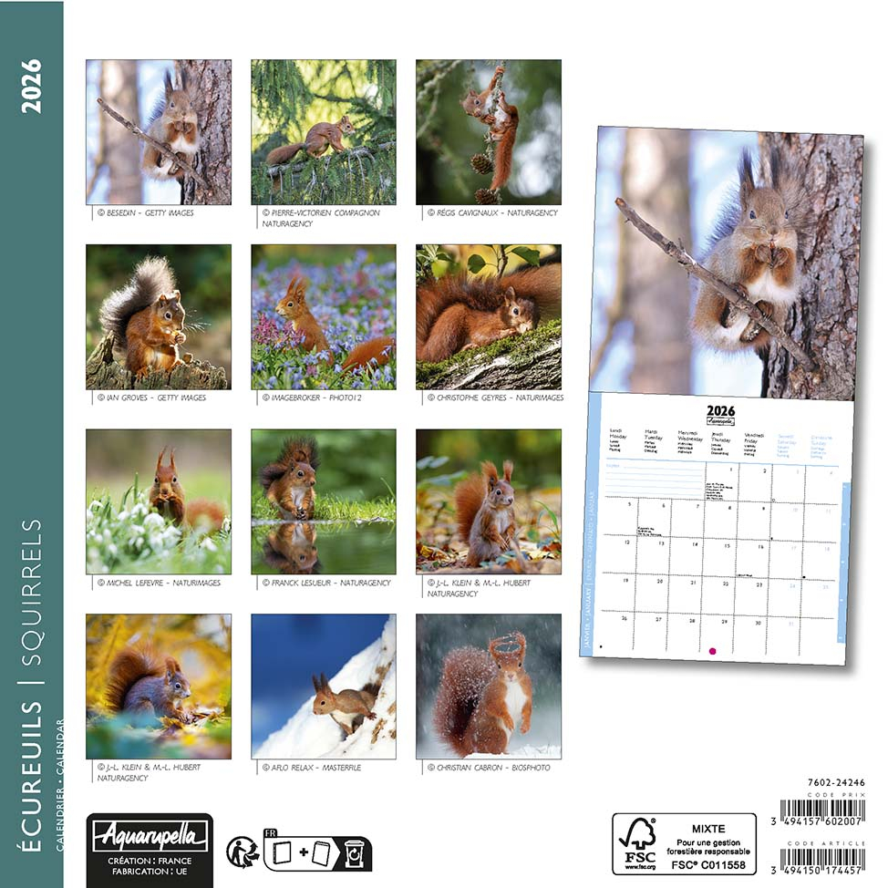 Le calendrier mural 2026 Écureuils est un calendrier 16 mois, couvrant la période de septembre 2025 à décembre 2026. Il se présente sous un format vertical, pratique à accrocher, et s’illustre chaque mois par une superbe photographie mettant en scène les petits acrobates des forêts : les écureuils. Ces images inspirantes accompagnent le rythme des saisons et offrent une pause visuelle apaisante au fil des mois.