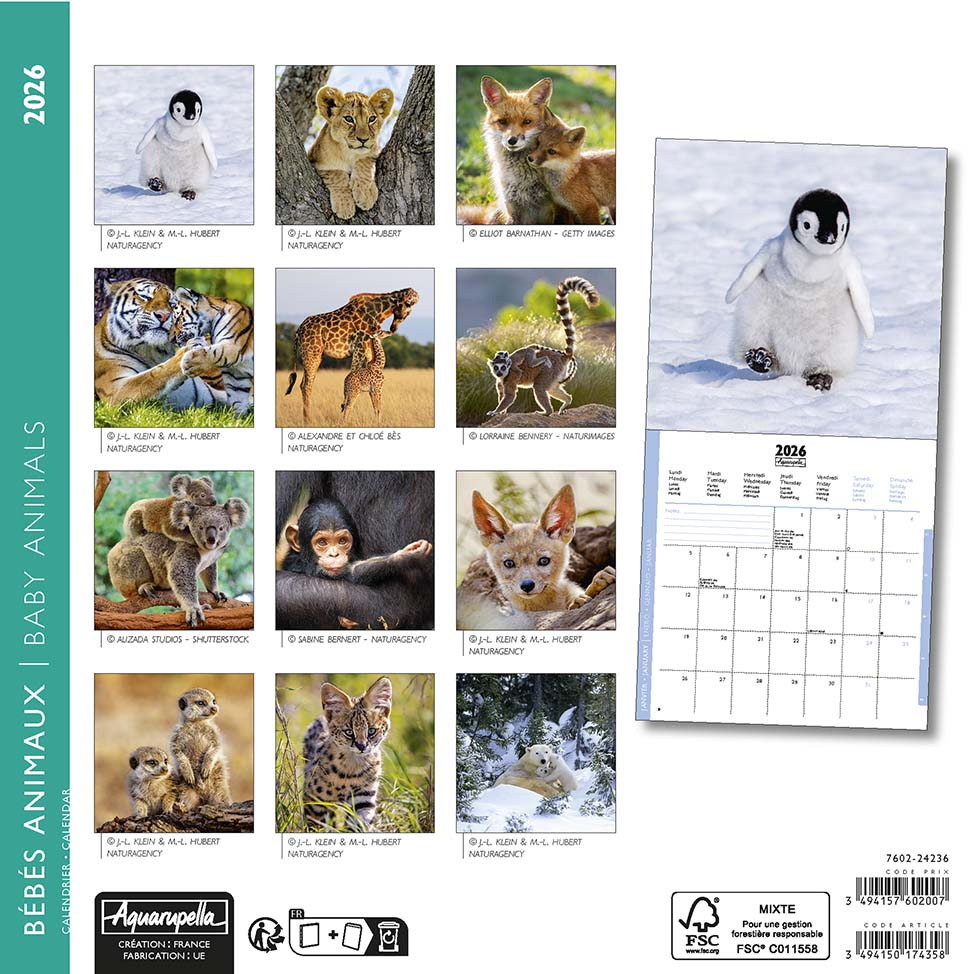 Le calendrier mural 2026 Bébés animaux est un calendrier 16 mois, couvrant la période de septembre 2025 à décembre 2026. Il se présente sous un format vertical, pratique à accrocher, et s’illustre chaque mois par une adorable photographie mettant en scène de jeunes animaux. Ces images inspirantes accompagnent le rythme des saisons et offrent une pause visuelle apaisante au fil des mois.
