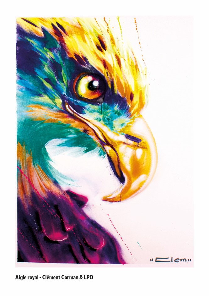 Cette carte postale met en valeur l’univers graphique de Clément Corman, artiste peintre spécialisé dans la peinture aérosol sur toile. Son travail engagé révèle ce que l’œil ne perçoit pas toujours : la disparition progressive du monde animal. À travers l’illustration de l'Aigle royal, espèce diurne à la fois majestueuse et impressionnante, il signe une création expressive et colorée.