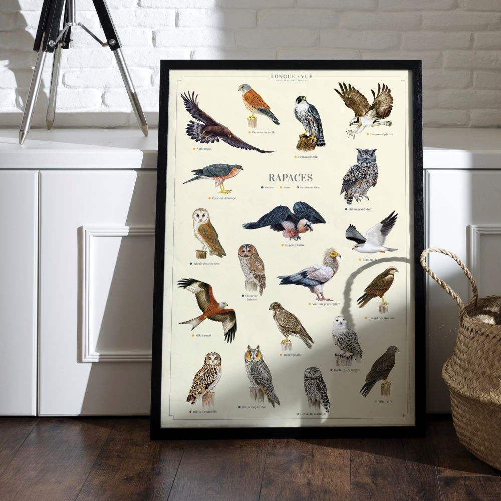 (Ref. PA0822)Illustration grand format des rapaces, une affiche naturaliste qui allie réalisme artistique et élégance décorative.