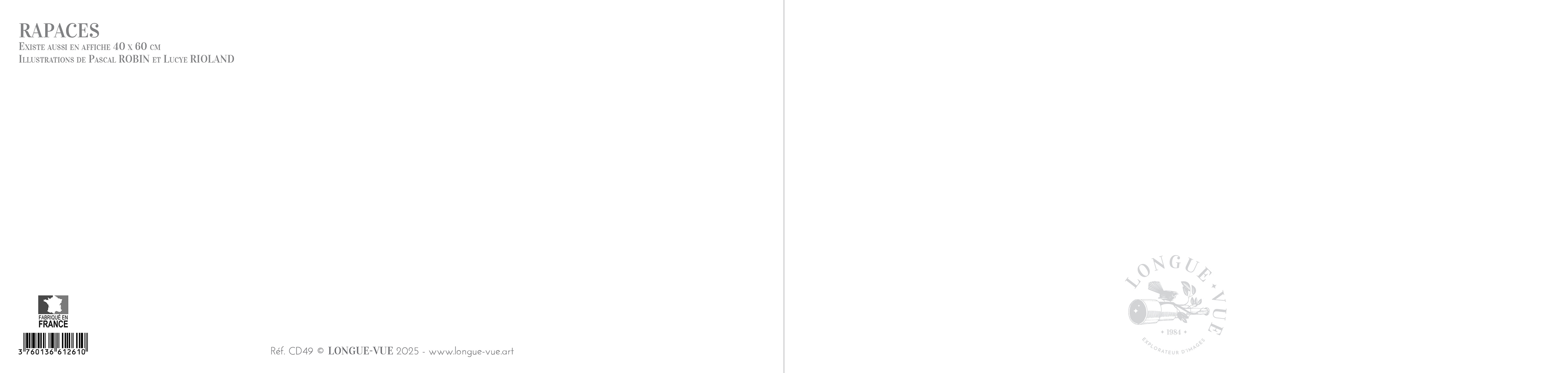Cette carte postale double met à l’honneur les rapaces, représentés avec un réalisme saisissant grâce au talent de Pascal Robin, illustrateur français spécialisé dans le naturaliste. Imprimée en France à partir d’encres végétales sur un papier couché mat 300 g/m² labellisé PEFC, elle s’inscrit dans une démarche respectueuse de l’environnement tout en valorisant la beauté de la faune sauvage.