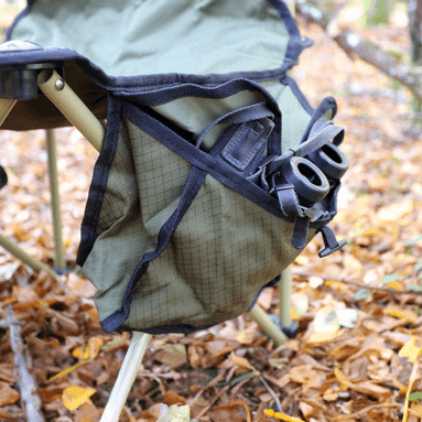 La chaise Koklass est équipée de deux poches latérales munies d’un système de fermeture silencieux qui permettent de ranger des objets volumineux de type jumelles, second boîtier, objectifs, matériel de prises de son, guides, bouteille d'eau...