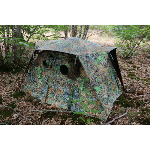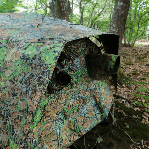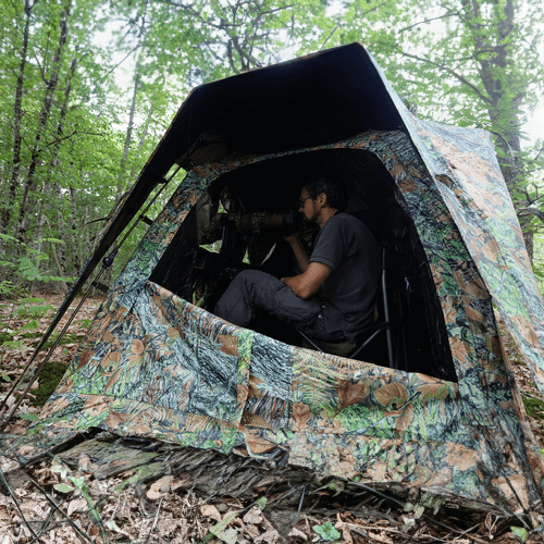 Elle a pour vocation de répondre à deux impératifs ; d’abord disposer d’une tente-affût qui permet de dormir dedans sur de longues périodes avec le confort nécessaire à des affuts de longue durée, mais également, permettant d’être à l’affut en binôme avec suffisamment d’espace à l’intérieur.