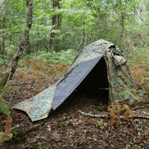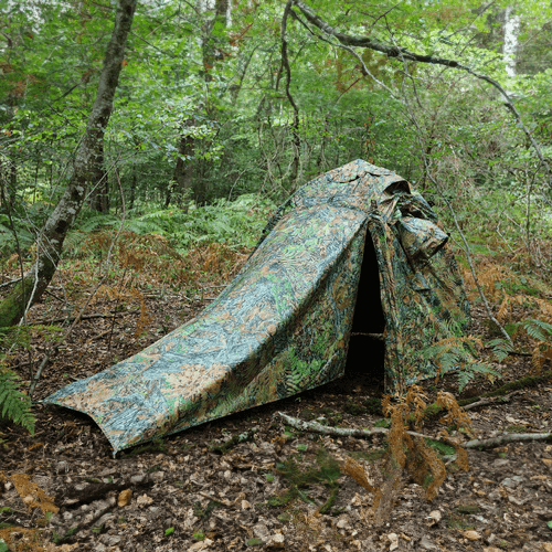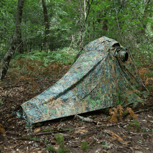 Auvent pour tente d'affût V6, réalisé en polyester 150D « oxford » recouvert d’une induction PU noir avec un motif Camouflage similaire à l’Affût Tragopan V6.