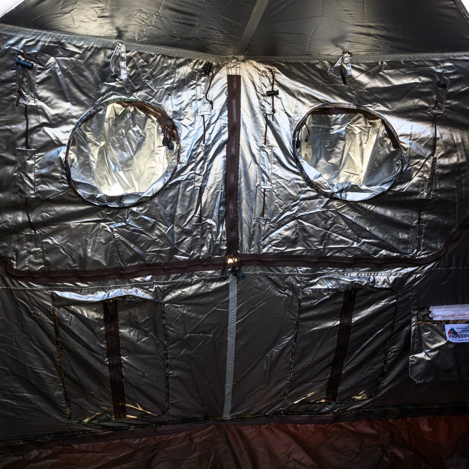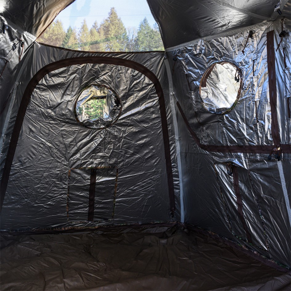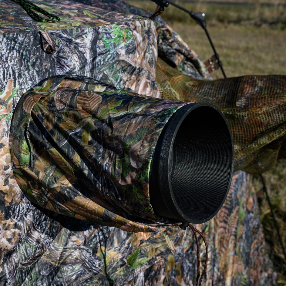 Livrée avec différentes fenêtres interchangeables et manchons d’objectif compatibles avec chaque ouverture, elle comprend également des dispositions prévues pour l’utilisation d’un flash. Le système de fenêtres est conçu pour empêcher toute infiltration d’eau grâce à un rabattant anti-pluie recouvrant intégralement les fermetures éclair, manipulables de l’extérieur lorsque les ouvertures ne sont pas utilisées. Les fenêtres peuvent être ouvertes silencieusement de l’intérieur via deux cordes, assurant une approche discrète. Chaque ouverture comporte aussi une petite fenêtre d’observation pouvant être ouverte ou fermée, idéale pour une longue-vue ou des jumelles. La visibilité est complète tout autour de l’affût !