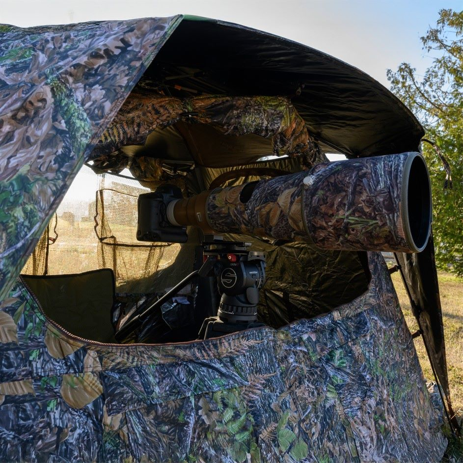 Très facile à installer, la Monal V3 se monte et se démonte en quelques minutes grâce à un HUB robuste. Son sol amovible peut être conservé pour y dormir ou pour travailler confortablement sur terrain humide. L’affût bénéficie d’une excellente ventilation assurée par un double-toit recouvrant une partie de la structure en maille, limitant la condensation par temps froid et prévenant la surchauffe en plein soleil. En cas de fortes chaleurs, un manchon d’objectif optionnel en filet peut être ajouté sur l’une ou les deux portes pour accentuer la circulation d’air.